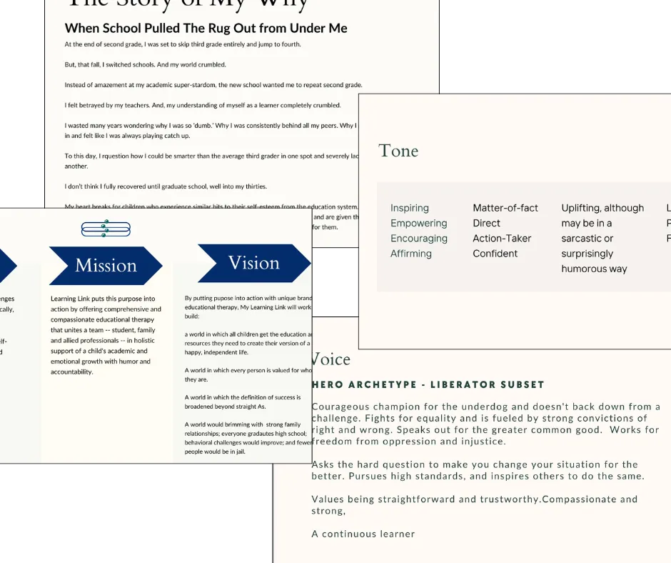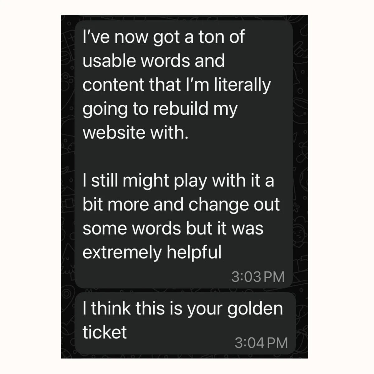 I've gone through countless brand workbooks, struggling to put my voice into words. In just 4 questions I had chills. In 90 minutes I could completely rewrite my homepage to reflect who I am and what my brand truly stands for.